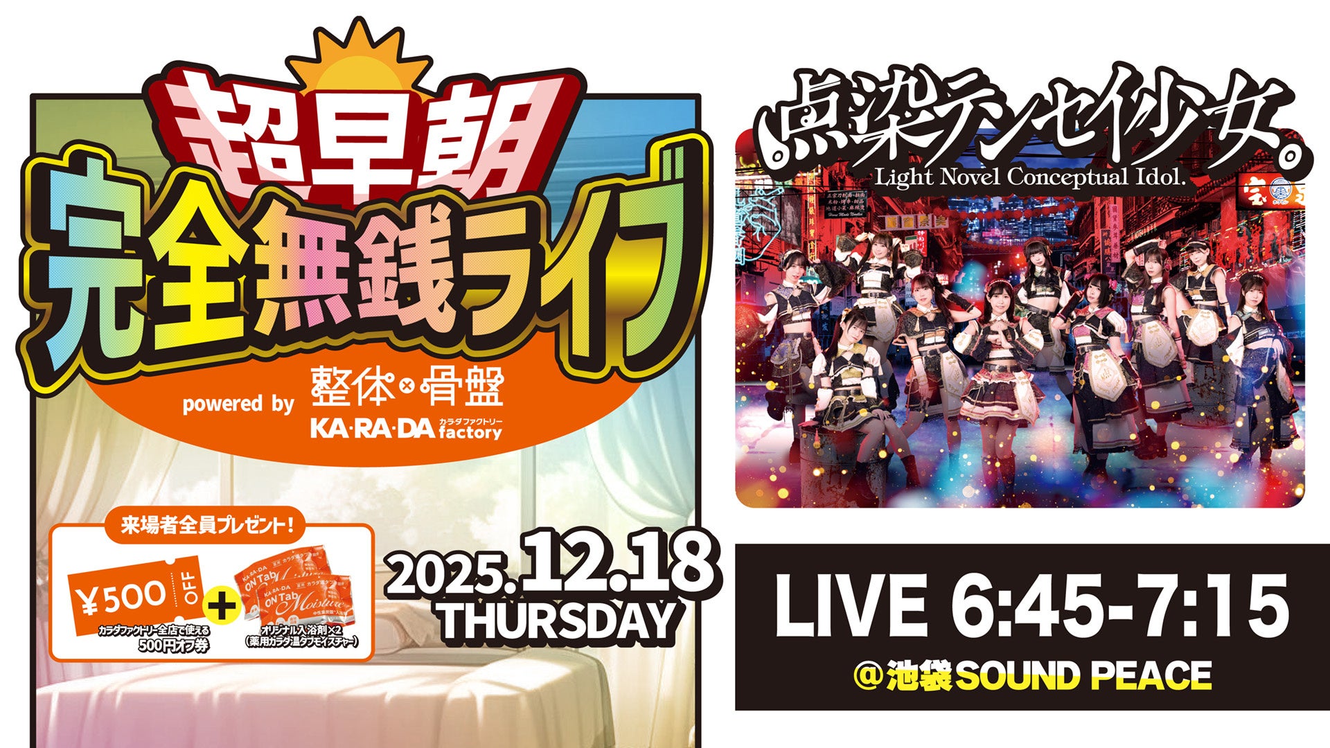 整体×骨盤サロン「カ・ラ・ダ ファクトリー」(以下 カラダファクトリー)を展開する株式会社ファクトリージャパングループ(本社:東京都千代田区、代表取締役社長:髙橋 健介、以下 ファクトリージャパン)は、2025年12月18日(木)に、池袋SOUND PEACEにおいて、人気アイドルグループ「点染テンセイ少女。」(通称:テンテン / 所属事務所「KABUKIMONO’DOGs」 東京都豊島区、代表:大城 文哉)とタッグを組み「点染テンセイ少女。超早朝 完全無銭ライブ powered by カラダファクトリー」を開催いたします。
